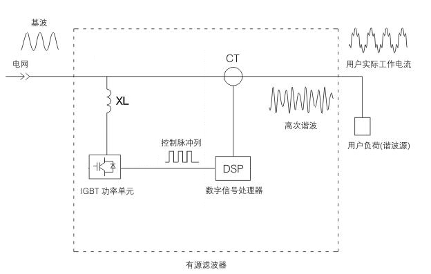 有源濾波器通過(guò)CT實(shí)時(shí)檢測(cè)線路電流,并把被檢測(cè)到的諧波轉(zhuǎn)化為數(shù)字信號(hào)處理器中的控制信號(hào)。同時(shí),數(shù)字信號(hào)處理器產(chǎn)生一系列脈寬調(diào)制信號(hào),驅(qū)動(dòng)IGBT功率模塊通過(guò)線路電抗器向電網(wǎng)輸出相位正好與電網(wǎng)諧波電流方向相反,而幅值大小相等的電流,兩種諧波電流正好相互抵消,從而達(dá)到濾除諧波、凈化電網(wǎng)電流的目的。
